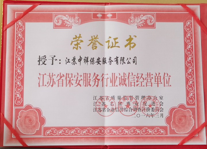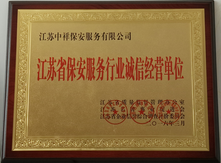 江蘇中祥保安公司榮獲江蘇省保安服務(wù)行業(yè)誠信經(jīng)營(yíng)單位